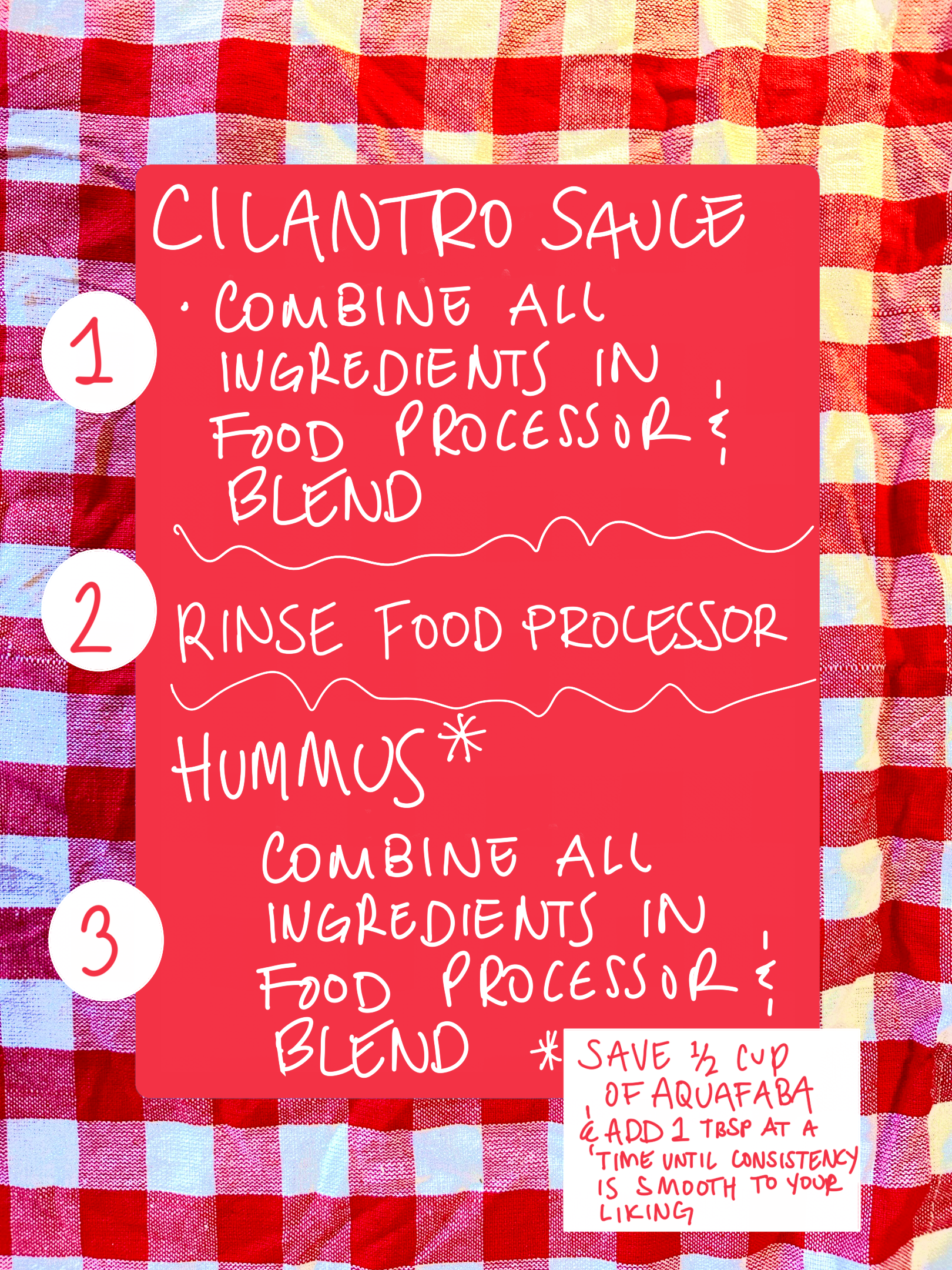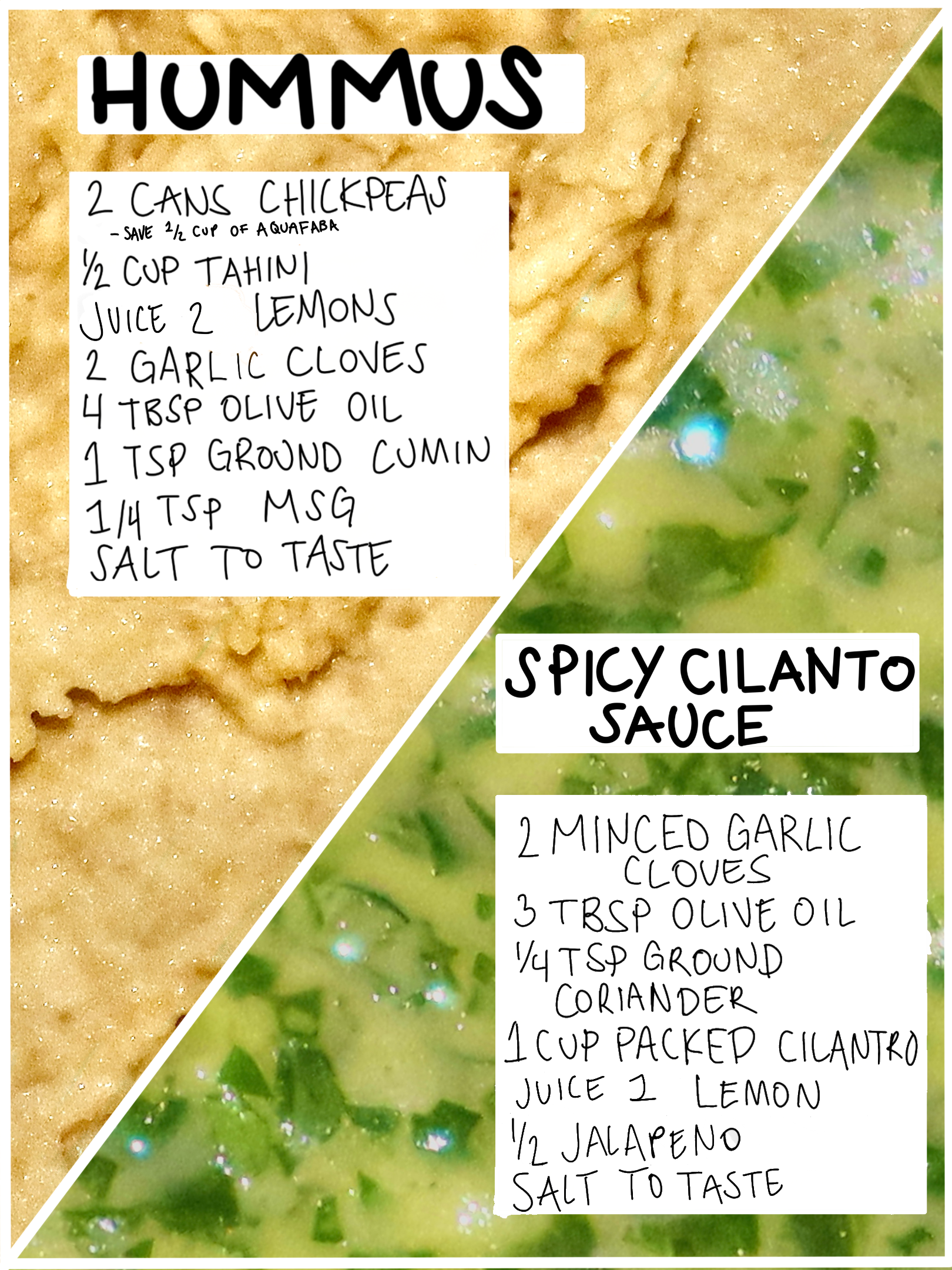 I love homemade hummus so much that once I started eating it at restaurants store bought was ruined for me. Luckily, I found out how ridiculously easy it is to whip up at home and it became a staple midday snack in my house. There are technically two recipes here, the hummus and the cilantro sauce. The hummus recipe is pretty normal with the exception of two ingredients, MSG and aquafaba.