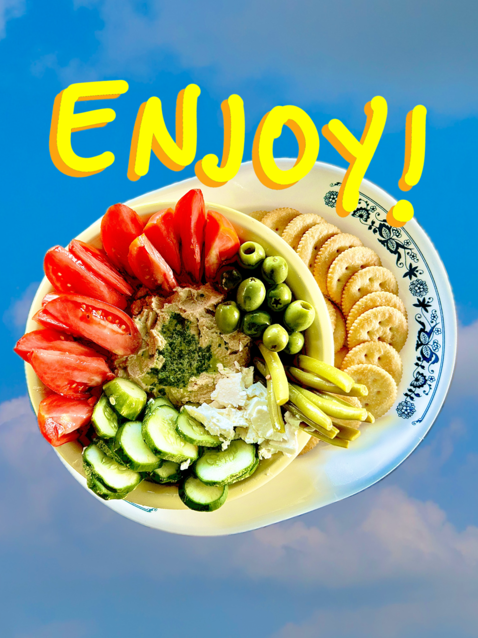 As you can see above, I chose to eat my hummus and spicy cilantro sauce as a dip. With crackers, tomatoes, cucumbers, pickled green beans, olives, and feta. But it’s just as good on an open face sandwich with all the fixings on it.