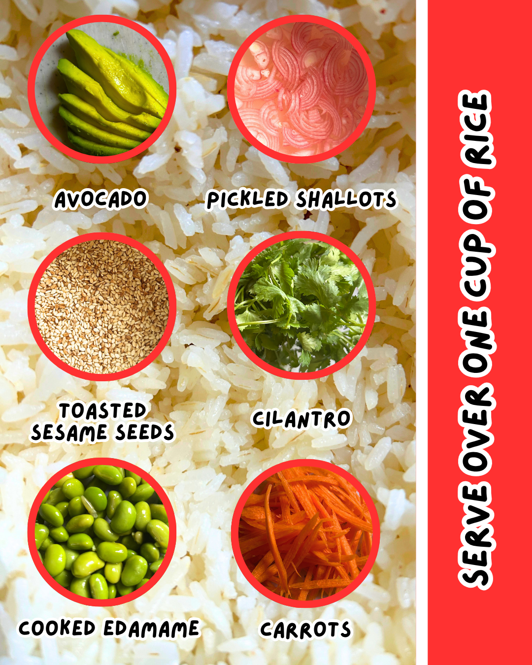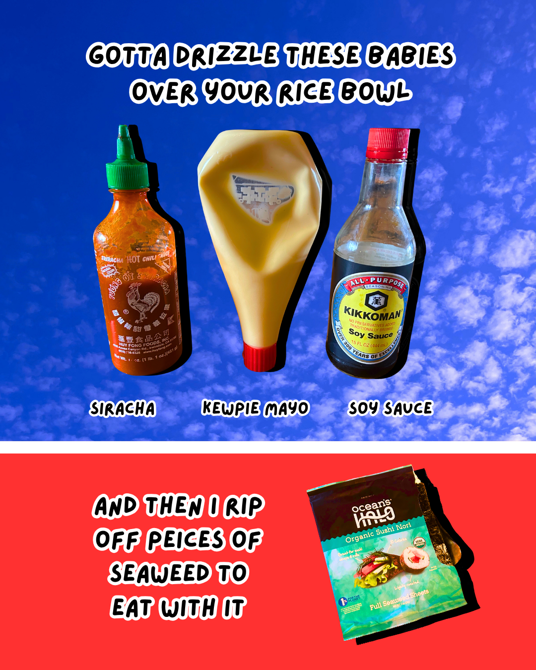 I don’t measure when making a poke bowl; I prep my ingredients and toss them together like a salad over my rice. Then I drizzle the condiments on top and eat it with seaweed.